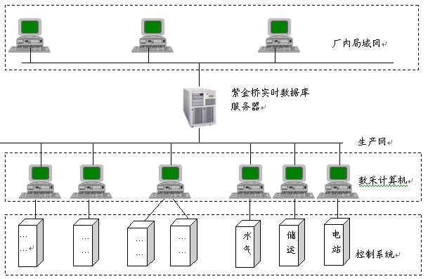 下圖是某大型生產係統的連接示意圖,管理人員通過本廠主頁進入係統,即可察看到各車間的生產畫麵,可以瀏覽實時數據、察看報警、和曆史記錄。