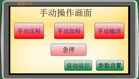 1、HMI部分,如圖3所示為手動操作畫麵,功能是在工藝處於手動時,用戶可以手動選擇壓料、加(jia)料(liao)和(he)輸(shu)送(song),要(yao)停(ting)止(zhi)相(xiang)應(ying)的(de)工(gong)序(xu)隻(zhi)需(xu)再(zai)點(dian)擊(ji)一(yi)下(xia)對(dui)應(ying)的(de)按(an)鈕(niu)即(ji)可(ke)。每(mei)個(ge)畫(hua)麵(mian)都(dou)有(you)一(yi)個(ge)急(ji)停(ting)圖(tu)標(biao),表(biao)示(shi)當(dang)前(qian)處(chu)於(yu)急(ji)停(ting)狀(zhuang)態(tai),此(ci)時(shi)所(suo)有(you)工(gong)序(xu)停(ting)止(zhi),當(dang)控(kong)製(zhi)箱(xiang)的(de)急(ji)停(ting)按(an)鈕(niu)彈(dan)起(qi)時(shi),急(ji)停(ting)狀(zhuang)態(tai)解(jie)除(chu),拍(pai)下(xia)時(shi)進(jin)入(ru)急(ji)停(ting)狀(zhuang)態(tai)。