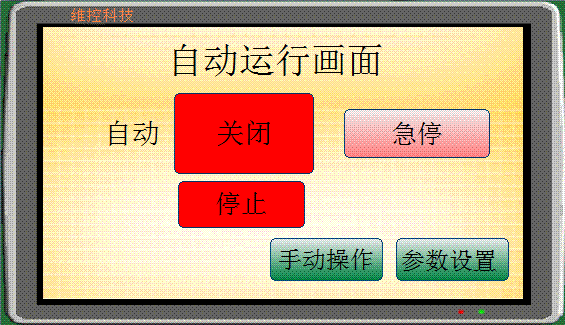 如圖4所示為自動運行畫麵,用來啟動和關閉自動運行模式,開啟後,可以用界麵上的按鈕,或者控製箱上的按鈕控製工序啟動和停止。