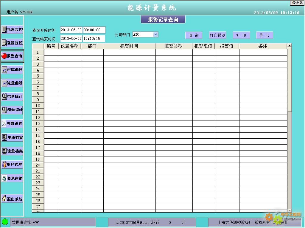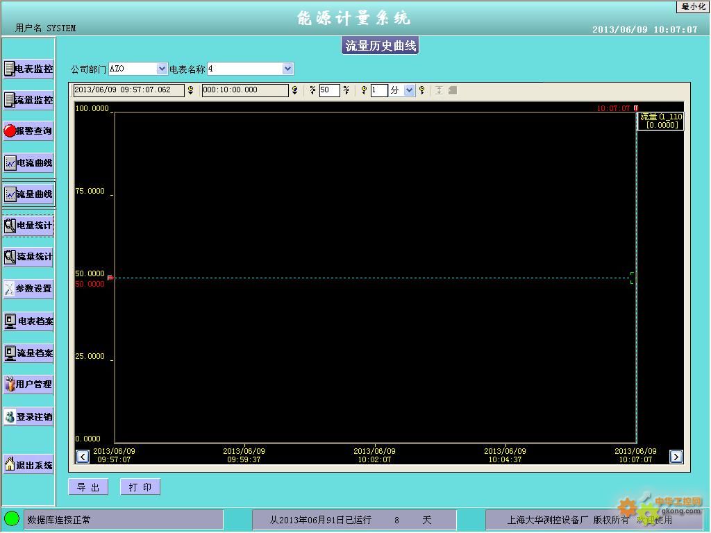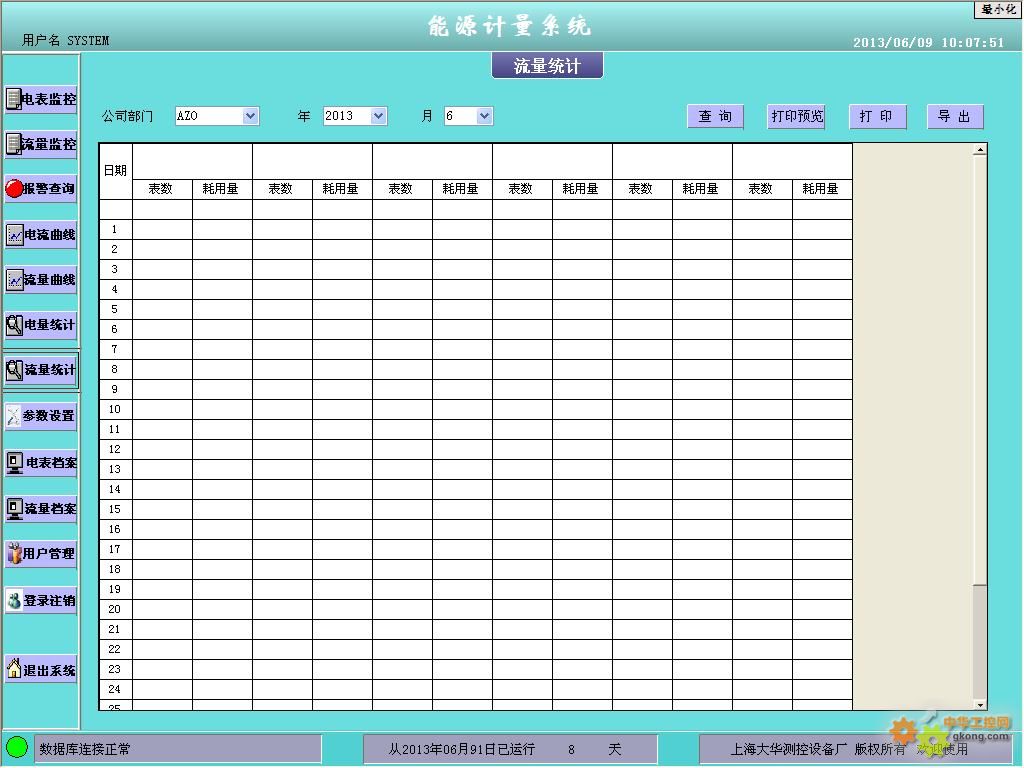 流量統計,可以按部門查詢流量計的累計流量和每天的用消耗量。報表支持打印預覽、打印、導出等.