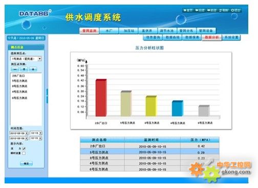 4)遠程監測各區域用水總量和用水大戶的用水量信息。 ◆ 數據統計分析 1)數據查詢:支持各種監測信息、控製信息、報警信息、操作信息的存儲和查詢,支持數據導出和打印功能。 2)統計與分析:自動生成製水、供水各生產環節的彙總報表和統計報表;自動生成各項生產數據的曆史曲線、柱狀圖、餅圖等分析圖表。