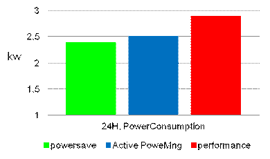 通過上麵的圖表我們可以了解到,1點至7點期間的CPU使用率最低,然而,即使運行在省電模式下,每片板卡仍然在消耗電能。在這種情況下,每片板卡在主動電源管理的策略下會消耗90W的功耗,峰值性能時會上升至140W。解決的辦法就是利用實時遷移策略,用最少的CPU刀片在處理這些工作負載,同時將節能模式下的刀片切換到睡眠模式,這樣相比主動電源管理的模式可以節約超過25%的功耗。