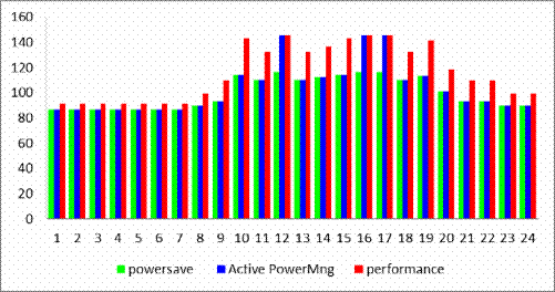 通過策略的配置,將ATCA刀片上CPU的工作模式切換至節能或主動電源管理模式後,每個刀片的功耗相比持續運行在性能模式下減少15%(參見圖4和圖5)。每片板卡在加載服務的情況下可以節約0.4KW的功耗(參見圖5)。如果一個14槽的ATCA機框中使用了10個刀片,那每天節約的功耗大約4KW。