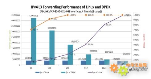 從圖9可以看出,搭配DPDK後的處理器刀片的IPv4轉發性能,可以讓客戶以更好的性價比成本,將包處理應用從基於硬件的網絡處理器移植到基於x86的計算平台,同時使用同一個平台來部署不同的服務,如程序處理、控製處理和包處理服務。更多關於我們的測試過程和結果,請登錄淩華科技網站www.adlinktech.com 查詢淩華科技的技術白皮書:采用Intel® DPDK技術的淩華科技aTCA-6200刀片式服務器完美實現包轉發服務性能的提升。