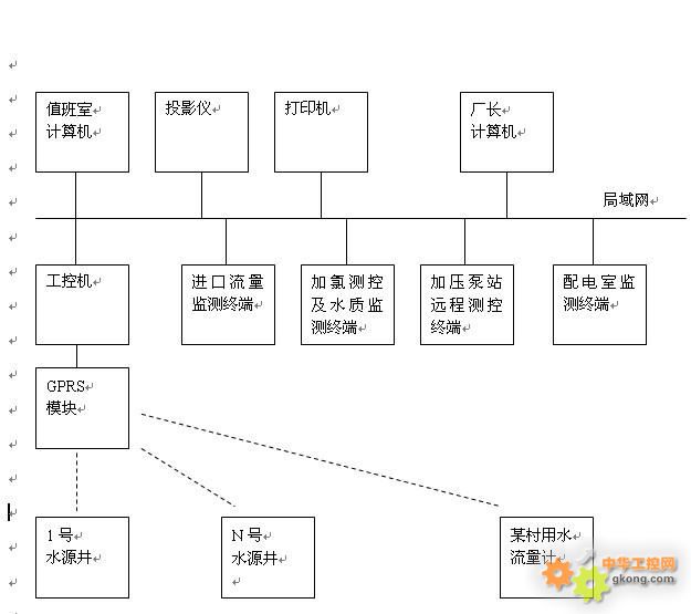 一、概述: 為(wei)解(jie)決(jue)農(nong)村(cun)飲(yin)水(shui)安(an)全(quan)問(wen)題(ti),很(hen)多(duo)地(di)方(fang)建(jian)立(li)了(le)小(xiao)型(xing)水(shui)廠(chang),集(ji)中(zhong)為(wei)一(yi)些(xie)村(cun)鎮(zhen)供(gong)水(shui)。農(nong)村(cun)水(shui)廠(chang)自(zi)動(dong)化(hua)與(yu)配(pei)電(dian)是(shi)水(shui)廠(chang)建(jian)設(she)中(zhong)的(de)重(zhong)要(yao)部(bu)分(fen),以(yi)下(xia)對(dui)該(gai)部(bu)分(fen)內(nei)容(rong)做(zuo)簡(jian)要(yao)介(jie)紹(shao)。 二、農村集中供水形式: 各地根據自身的水資源及地勢情況確定供水形式,主要包括以下幾種: 1、直供井供水:每個村鎮打一眼或多眼深井,直接通過管網為村鎮供水。 2、一眼或多眼水源井取地下水,進入小型水廠,加氯,進入清水池,再通過幾套加壓泵為不同村鎮供水;有的小型水廠清水池地勢較高,可通過自流為不同的村鎮供水。 3、一個或多個取水泵站取地表水,進入小型水廠後,經加藥加氯等工藝處理進入清水池,再通過幾套加壓泵為不同村鎮供水;有的小型水廠清水池地勢較高,可通過自流為不同的村鎮供水。 三、農村水廠自動化解決方案 yidierzhonggongshuixingshiweilijieshaoshuichangzidonghuaxitong。duoyanshuiyuanjingqudixiashui,yuanshuijinruxiaoxingshuichang,jialv,jinruqingshuichi,zaitongguojitaojiayabengweibutongcunzhengongshui。 1、總體方案設計 ◆ 在水源井井房內安裝水源井遠程測控終端。 ◆ 在水廠進水口安裝流量監測終端。 ◆ 在水廠加氯間安裝加氯設備遠程測控及水質監測終端。 ◆ 在水廠加壓泵房安裝加壓泵站遠程測控終端。 ◆ 在水廠低壓配電室安裝配電監測終端。 ◆ 在水廠值班室安裝工控機、計算機、投影儀、打印機等。安裝監控係統軟件。 ◆ 流量監測終端、加氯設備遠程測控及水質監測終端、加壓泵站遠程測控終端與值班室工控機之間采用局域網有線通信方式;水源井遠程測控終端與值班室工控機之間采用GPRS無線通信方式(支持光纖通信方式)。 ◆ 未來,水廠需要對各用水單位進行流量監測,采用GPRS無線通信方式。 2、係統拓撲圖