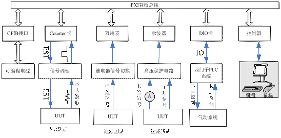 係統組成如圖2所示,係統采用上下位機設計。上位機核心是PXI係統,主要由PXI機箱、控製器、數字I/O模塊、示波器模塊、萬用表模塊、計數器、信號調理和編程電源等模塊組成。PXI係統內部通過PXI總線進行數據傳輸。另外,由於此係統是全自動化測試流水線,運動過程全部由汽缸控製完成,所以下位機采用了西門子S7300係列PLC係統,主要完成對氣缸的動作控製以及狀態監測。上下位機通過數字I/O握手方式進行通訊。