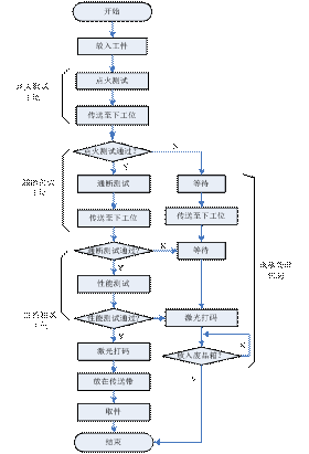 測(ce)試(shi)內(nei)容(rong)完(wan)成(cheng)後(hou),機(ji)械(xie)手(shou)將(jiang)被(bei)測(ce)件(jian)傳(chuan)遞(di)到(dao)打(da)碼(ma)工(gong)位(wei),並(bing)且(qie)根(gen)據(ju)測(ce)試(shi)結(jie)果(guo)程(cheng)控(kong)改(gai)變(bian)打(da)碼(ma)機(ji)打(da)碼(ma)內(nei)容(rong),完(wan)成(cheng)打(da)碼(ma)操(cao)作(zuo)。合(he)格(ge)件(jian)被(bei)放(fang)置(zhi)在(zai)傳(chuan)送(song)帶(dai)上(shang),自(zi)動(dong)運(yun)輸(shu)到(dao)操(cao)作(zuo)員(yuan)工(gong)位(wei)。不(bu)合(he)格(ge)件(jian)機(ji)械(xie)手(shou)自(zi)動(dong)扔(reng)進(jin)廢(fei)品(pin)箱(xiang),並(bing)通(tong)過(guo)傳(chuan)感(gan)器(qi)對(dui)成(cheng)品(pin)和(he)廢(fei)品(pin)個(ge)數(shu)分(fen)別(bie)計(ji)數(shu)並(bing)加(jia)以(yi)統(tong)計(ji)。