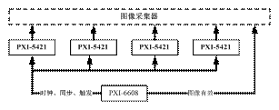 硬件信號連接如圖2所示。PXI-6608是一款8通道的計數器/定時器模塊,其內部時鍾精度可達75ppb,在本係統中主要用於產生時鍾信號、圖像有效信號及係統內部用於同步和觸發的輔助信號。