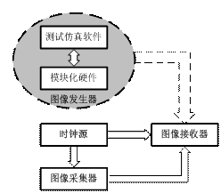 目mu前qian,圖tu像xiang接jie收shou器qi已yi完wan成cheng初chu步bu設she計ji,為wei降jiang低di係xi統tong設she計ji的de風feng險xian和he成cheng本ben,采cai用yong硬ying件jian在zai環huan仿fang真zhen技ji術shu對dui圖tu像xiang接jie收shou器qi進jin行xing測ce試shi,並bing在zai測ce試shi成cheng功gong後hou繼ji續xu仿fang真zhen圖tu像xiang采cai集ji器qi的de輸shu出chu數shu據ju,以yi模mo擬ni產chan生sheng某mou些xie實shi驗yan條tiao件jian。其qi原yuan理li如ru圖tu1虛線部分所示。模塊化硬件結合測試仿真軟件組成圖像發生器,用於仿真時鍾源和圖像采集器的實際功能,產生各種時鍾和圖像信號。