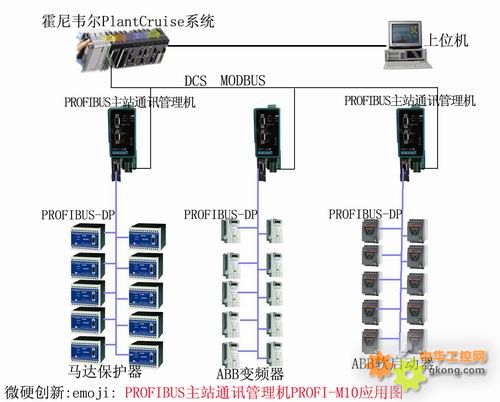 該項目選用霍尼韋爾最新研發的PlantCruise的DCS係統,變頻、軟起選用ABB品牌,電機保護選用納宇。霍尼韋爾的DCS係統采用的是MODBUS總線通訊,由於從站數量較多,(280個電機保護、60台變頻、75個軟起動)如果都采用MODBUS通訊,這樣通訊效率會非常低,400多個從站輪詢一周預計要到30S以上了。因此方案采用PROFIBUS總線通訊,現場變頻、軟起、儀表都選用帶PROFIBUS-DP接口。但是霍尼韋爾的DCS係統目前不支持PROFIBUS主站功能,因此設計師應用北京微硬創新科技有限公司的PROFIBUS主站通訊管理機PROFI-M10順利將PROFIBUS-DP從站設備接入DCS的MODBUS總線。