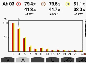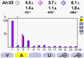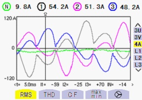 投入安裝ANAPF有源濾波器後LED屏控製開關櫃進線側最大的總諧波電流含量降至51%,總諧波電壓畸變率降至3.1%,零線總諧波畸變率94.1%。3次諧波電流量A相1.4A、B相1.1A、C相1.8A、零線電流9.8A,含諧波功率因數提高至0.81。總諧波電壓畸變率THDu值降至3.3%。3次諧波電壓降至低於國標要求380V低壓側諧波電壓奇次畸變率THD≤4%的要求。 由上圖對比可見,ANAPF有源濾波器保護了LED供電係統安全、穩定、經濟運行,防止過電流速斷保護的誤動作,有利於電網和係統的安全穩定運行。