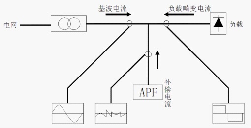 3.1 ANAPF有源電力濾波裝置的工作原理 ANAPF係列有源電力濾波裝置,以並聯的方式接入電網,通過實時檢測負載的諧波和無功分量,采用PWM變流技術,從變流器中產生一個和當前諧波分量和無功分量對應的反向分量並實時注入電力係統,從而實現諧波治理和無功補償。(見圖1)