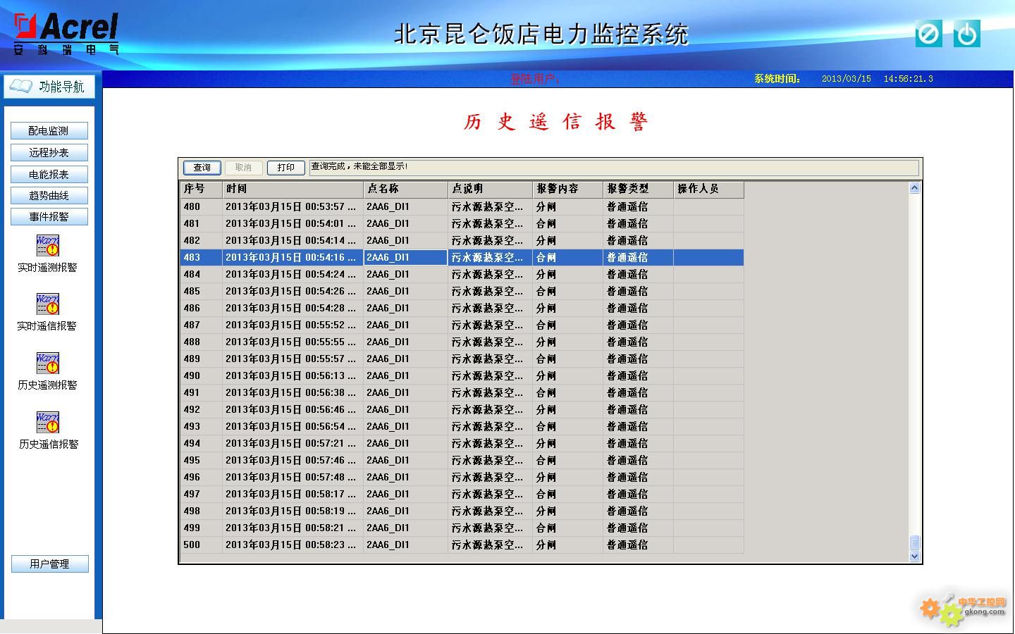 4.3事故報警和追憶:電力監控係統定義了所有配電回路過負荷及開關量變位實時報警和曆史報警查詢等功能,如下圖6所示,列表中列出報警發生的時間、回路名稱、回路編號、數據點、報警內容和報警值等數據。