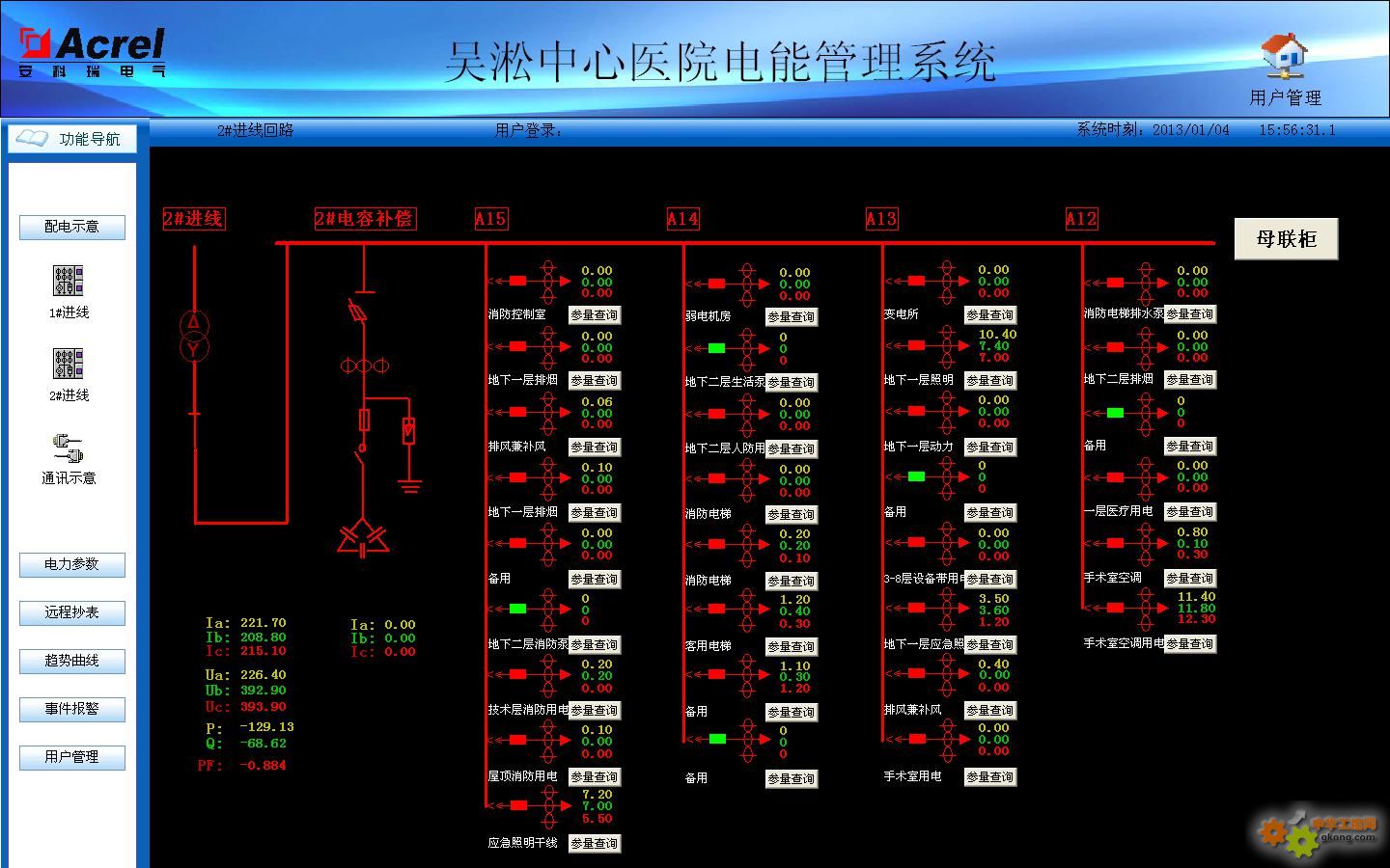 隨著社會的發展及電力的廣泛應用,智能電能管理係統已成為大型公共建造的必然選擇,本文介紹的電力儀表及Acrel-3000電能管理係統在吳淞中心醫院項目的應用,可以實現遠程遙測、遙信功能,實時顯示了現場電參量,方便值班人員查看;給高級用戶設置定值修改功能同樣人性化地提高了值班人員操作的安全係數;同時係統實現對采集數據的分析、處理,並生成各種電能報表、分析曲線、棒圖等,便於電能的遠程抄表以及分析、研究;報警窗口的彈出有助於提醒值班人員及時檢查現場設備的運行狀況。