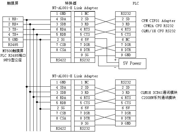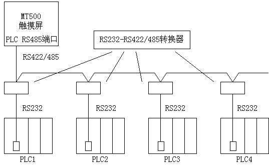 由於RS232無法支持多點(multi-drop)的連接方式,所以當“一屏多機”係統中的PLC沒有RS422/485端口時,必須配置通訊適配器將RS232轉換成為RS422/485信號才能連接。具體的係統硬件連接隨著采用的PLC的不同而不同,下麵是兩個通用的圖例: 1. PLC為RS232通訊端口: 2. PLC為RS422/485端口 各個廠商的通訊協議支持的站點數量不同 ,請不要超過他們限製的範圍,另外各個PLC生產廠家都會提供RS232-RS422/485的轉換器,或者將專用接口轉換為RS422/485的通訊適配器,您可以根據廠家的建議來組成以上的“一屏多機”係統,也可以采用自己選擇的轉換器和適配器來連接,但需要注意參考硬件的使用手冊,以避免接線的錯誤造成無法通訊。 下麵是以OMRON 係列PLC為例的兩種具體接線圖: 1. 利用HostLink協議通過PLC或模塊的RS232端口經RS232-RS422/485轉換器連接