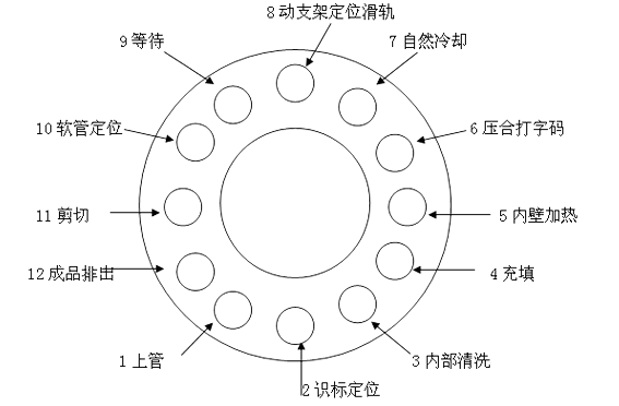 管倉(軟管容器) → 自動上管→ 識標定位 →軟管內部清洗(選項)→ 充填 → 尾部熱熔 → 壓合封尾、打字碼 →軟管定位→剪切→成品排出。