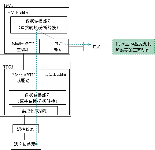 反之,如果我們將溫控儀表端加以延伸,那麼,我們看到,可以通過ModbusRTU從驅動程序,將TPC3模擬出一個Modicon的PLC了。TPC1會主動將讀取TPC3的信息,然後,繼續下麵的信息流。如圖3.1.3所示: