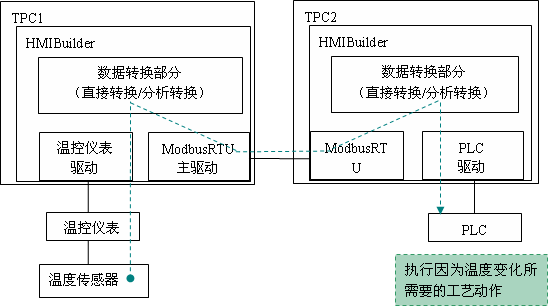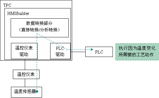 這時,HMIBuilder提供基於現場總線的溫控儀表的驅動,采集現場溫度參數。如果工藝要求的溫度可以觸發PLC的過程控製執行單元完成某個動作,那麼,一種是這個控製邏輯可以在HMIBuilder運行的後台邏輯中,當溫度判斷符合條件,發出控製信號給PLC的I/O執行;另外一種是溫度信號直接轉換給PLC的某個寄存器,在PLC的運行邏輯中,判斷是否可以執行相應的工藝動作。