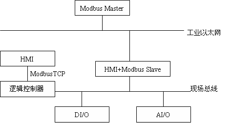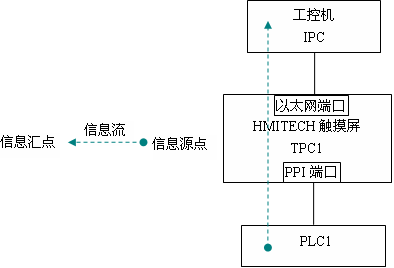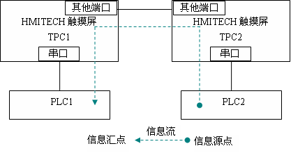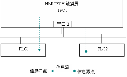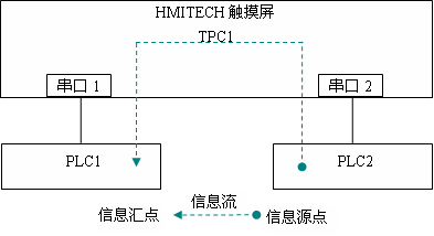 在工業現場,我們最常見的信息平行轉發是以觸摸屏人機界麵為核心的多智能儀表協同工作。圖3.1.1是信息平行轉發的實例: