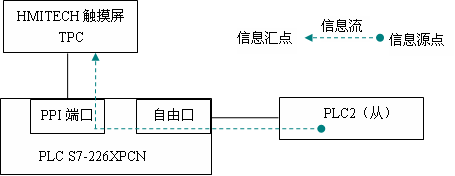 現場信息是通過PLC進行數據轉發的。我們可以看到信息源PLC2的數據是通過S7-226XPCN轉發給TPC的。這種轉發方式連接比較簡單,但對PLC的性能要求比較高,比如在上麵的PLC中,必須選用S7-200係列高端的PLC。同時,在S7-226XPCN中,需要做自由口通訊的編程,也有一定工作量和技術含量。