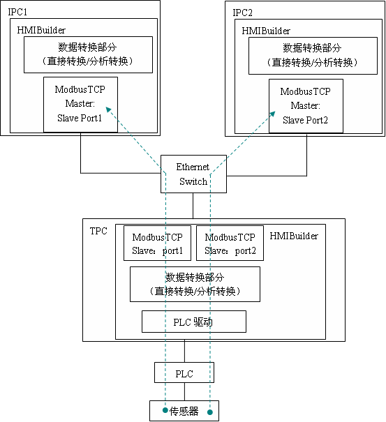 在基於eHMIBuilder的嵌入式觸摸屏TPC中,我們通過Modbus/TCP數據轉發方式,就成功地解決了現場控製係統中數據轉發的問題。如圖3.2.2所示: