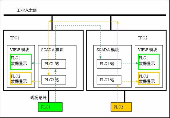 上圖中:PLC是數據源,實線表示物理連接,虛線箭頭表示數據流方向。通過上麵的示意圖,可以看出每個TPC設備都包括VIEW和SCADA兩個模塊,其中SCADA模塊接收由PLC設備傳送上來的數據,並在VIEW模塊中進行顯示。因其支持分布式計算,在任意TPC上都可以查看每個PLC的信息,從而實現數據共享。