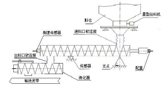 由you於yu螺luo旋xuan秤cheng本ben身shen的de工gong作zuo原yuan理li及ji結jie構gou特te點dian,從cong上shang方fang給gei料liao機ji落luo下xia的de物wu料liao的de衝chong擊ji,將jiang直zhi接jie通tong過guo剛gang性xing秤cheng體ti傳chuan遞di到dao稱cheng重zhong傳chuan感gan器qi上shang,影ying響xiang稱cheng重zhong信xin號hao的de真zhen實shi性xing,降jiang低di計ji量liang精jing度du。雖sui然ran將jiang秤cheng體ti支zhi點dian設she置zhi在zai星xing型xing給gei料liao機ji正zheng下xia方fang,以yi及ji在zai秤cheng體ti一yi端duan增zeng加jia配pei重zhong(如圖1所示),可以減少一部分通過剛性秤體傳遞到稱重傳感器上衝擊震動。但仍不能很好的滿足實際生產的需要。