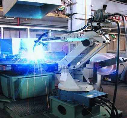 據了解,焊接機器人生產線由江蘇科技大學與昆山華恒焊接自動化工程技術研究中心、上海外高橋造船有限公司聯合研製,是由具有國際先進水平的機器人位置傳感技術、電弧跟蹤技術,以及由兩台機器人協同工作的主從控製技術、開啟式變位機鏈輪傳動裝置專利技術及MIG自動焊接專家係統等高新技術研製而成。