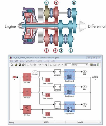 雙離合器變速箱橫截麵(俯視圖)及相關 SimDriveline 模型。帶顏色的塊對應的是齒輪和控製齒輪選擇的爪形離合器
