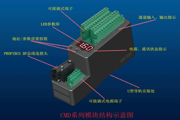 3.Profibus (CMDF5係列)模塊有標準總線連接口和一體化可拔插式總線、電源端子連接頭;