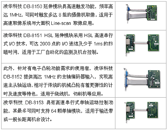 淩華運動控製延伸模塊DB係列包含DB-8150高速觸發延伸模塊、DB-8151 High Speed Link(HSL)省配線延伸模塊、DB-8152電子凸輪(E-CAM)主從軸設計延伸模塊,以及DB-8153 Motionnet 外接串行式單軸運動延伸模塊等四種產品,針對各種脈衝運動控製需求提供解決方案。