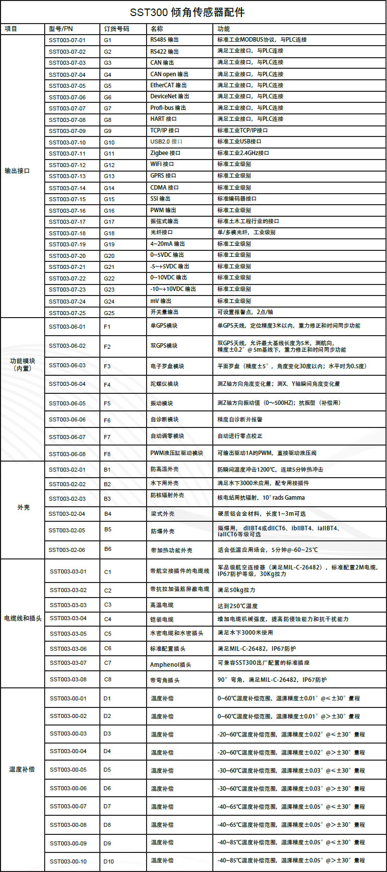 例如:需要購買一台雙軸傾角傳感器,測量範圍±15°,常溫精度±0.02°,-20~60℃溫度下的精度±0.02°,輸出Zigbee無線傳輸,2m電纜配插頭,帶振動抑製功能,防爆外殼。應選擇的傳感器型號為:SST302-15-G11-F5 -B5-C1。