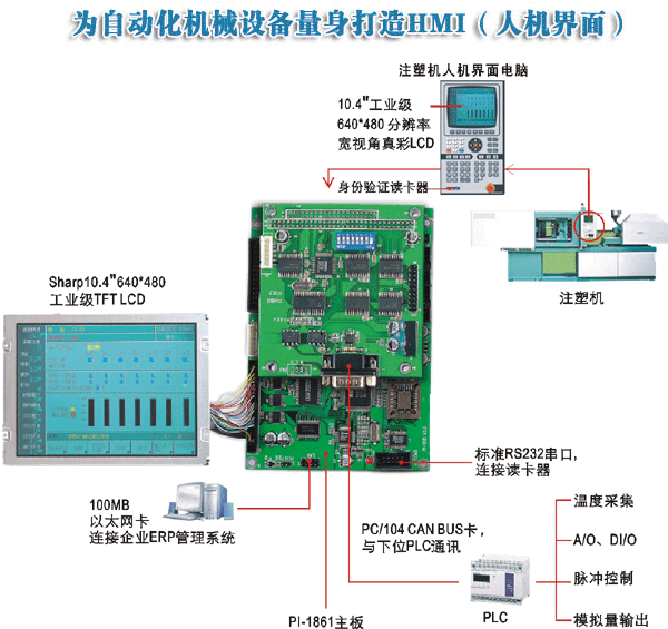 * 該注塑機控製電腦是基於英康仕自主研發的PI-1861嵌入式主板和CAN總線PC/104卡完成的; * 英康仕多年對嵌入式軟、硬件係統、ModBus、CAN BUS等工業現場總線的應用經驗,能快速為注塑機、紡織機、繡花機等機械設備定製人機界麵(HMI)電腦,幫助客戶降低成本。 * 歡迎洽談OEM/ODM合作。 * PI-1861嵌入式主板詳情請瀏覽 注塑機電腦解決方案詳情請瀏覽