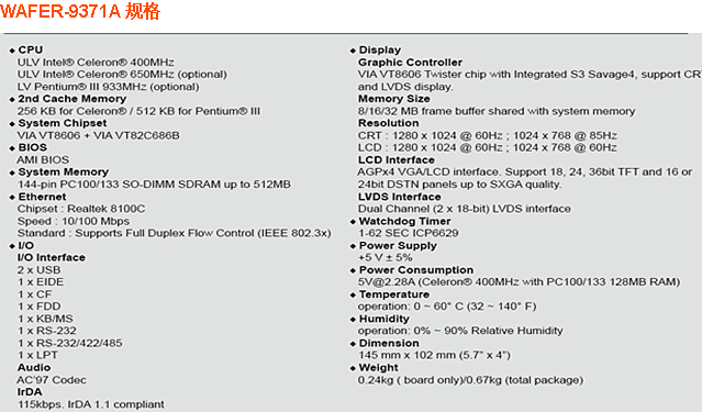 提供RoHS解決方案最快速的工業計算機供應商─ 威達電集團 (IEI Technology corp.) 發表了3.5” 板載 ULV Intel? Celeron 處理器嵌入式主板,帶音頻、VGA/LCD與LAN。 WAFER-9371A 確保係統運作的穩定性, 獨家散熱鰭片模塊設計,以簡化的組裝帶來高效率的散熱效果,絕佳的散熱和靜音表現!WAFER-9371A在所支持的LCD規格上,精心規劃為支持更多樣化的LCD顯示器,降低您的開發成本,用以創造出更豐富的產品線。其中包括: ● 無噪音、低溫工作 板載ULV Intel? Celeron? 400 / 650MHz處理器 (含散熱片) ,獨(du)特(te)的(de)散(san)熱(re)片(pian)密(mi)實(shi)粘(zhan)貼(tie)熱(re)導(dao)技(ji)術(shu),提(ti)供(gong)絕(jue)佳(jia)的(de)熱(re)傳(chuan)遞(di)效(xiao)果(guo),芯(xin)片(pian)上(shang)所(suo)產(chan)生(sheng)的(de)熱(re)能(neng)可(ke)以(yi)快(kuai)速(su)的(de)傳(chuan)導(dao)到(dao)散(san)熱(re)片(pian)上(shang),讓(rang)計(ji)算(suan)機(ji)係(xi)統(tong)更(geng)穩(wen)定(ding)運(yun)作(zuo)。 ● 支持最完整的LCD panel種類 支持36 bit TFT,16-bit / 24-bit LCD panel,分辨率最高支持至1024×768 ,支持雙通道LVDS接口,特地選用VIA Twister芯片- 市麵上支持最多樣化LCD規格的芯片組,確實降低您的開發成本與研發時間。 ● 無磁盤開機功能 IEI BIOS PXE係統支持Boot-on-LAN功能(ATX 電源供應) 。 ● 綠色環保產品 符合 RoHS 無鉛製程標準,與歐洲環保製程規範同步,與歐盟電子產品的危害物質限用指令環保法規同步,不用擔心抵觸RoHS 相關禁令。