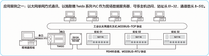 ● 提供多台巡測數采器數據上傳以太網的成熟解決方案,通過以施耐德的Twido+S9104構建的數據I/O服務器,可將多台(1~32台)的采集數據以MODBUS-TCP的通訊方式及單網口或雙網口的連網方式將數據上傳以太網,供多台主機共享。